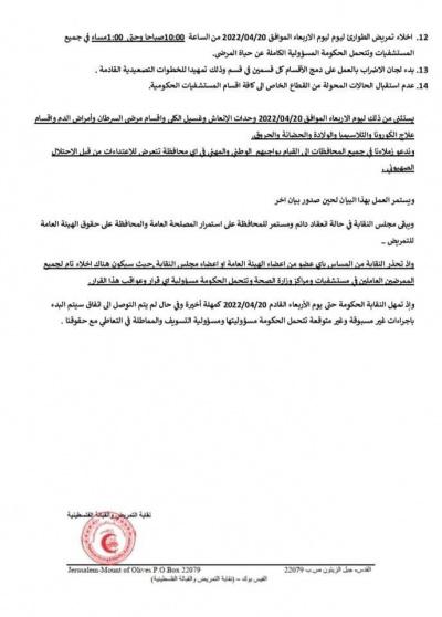 وشدد البيان على اضراب شامل في المستفيات غدا، وأن يكون الدوام لجميع التمريض ويشمل موظفي العقود بنسبة 30% واشغال الاقسام بنسبة 50% من الأسرة فقط.