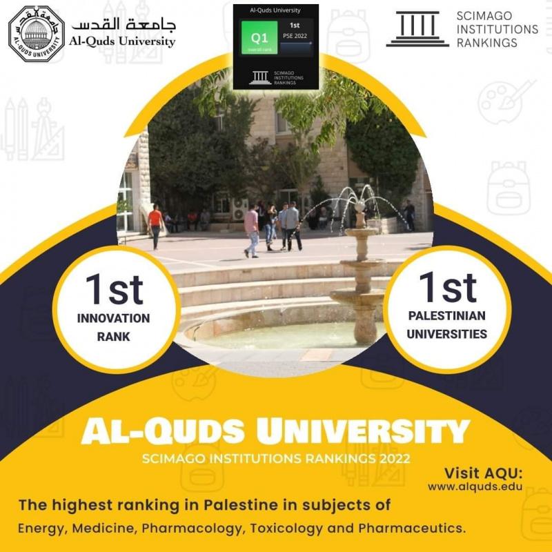 حصدت جامعة القدس المرتبة الأولى بين الجامعات الفلسطينية وفقًا لتصنيف جامعة SCIMAGO العالمية للربع الأول من عام 2022، فيما جاءت في المركز السابع والعشرين عربيًا، والمركز 660 من بين 8000 جامعة ومؤسسة بحثية عريقة حول العالم.