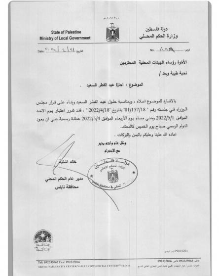 وفي تعميم للحكومة، جاء فيه "بالإشارة للموضوع أعلاه، وبمناسبة حلول عيد الفطر السعيد وبناء على قرار مجلس الوزراء في جلسته بتاريخ 18/4/2022".