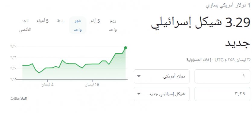 ووصل سعر صرف الدولار مقابل الشيكل الاسرائيلي، الآن، 3.29 شيكل.
