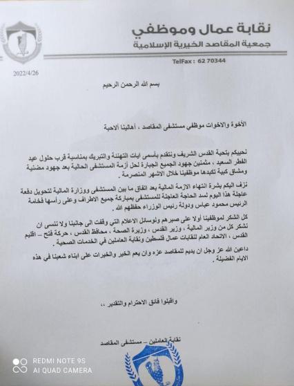 وفيما يلي نص إعلان نقابة عمل وموظفي مستشفى المقاصد:
