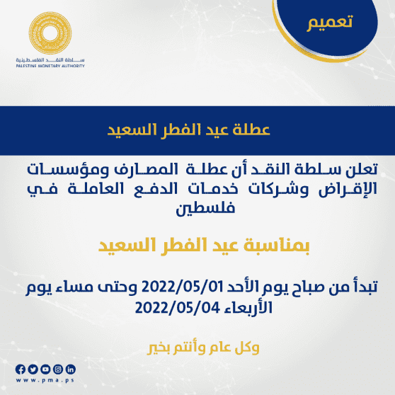 وأعلنت سلطة النقد في بيان لها، أن عطلة المصارف ومؤسسات الإقراض وشركات خدمات الدفع العاملة في فلسطين في عيد الفطر السعيد ستبدأ من صباح يوم الأحد القادم الموافق الأول من مايو 01/05/2022، وحتى مساء يوم الأربعاء الموافق الرابع من مايو 04/05/2022.