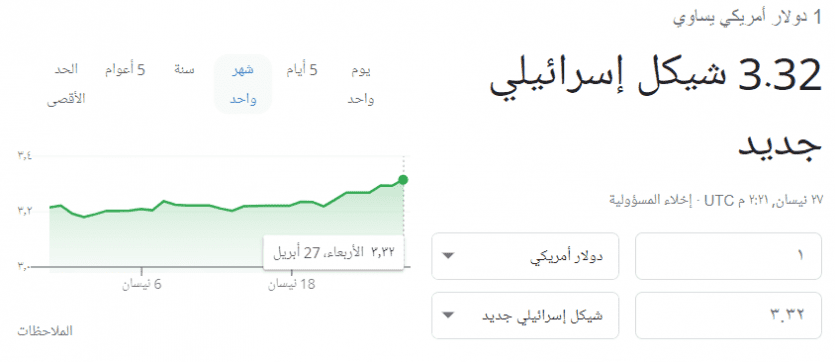 ووصل سعر صرف الدولار مقابل الشيكل الاسرائيلي، الآن، 3.32 شيكل.