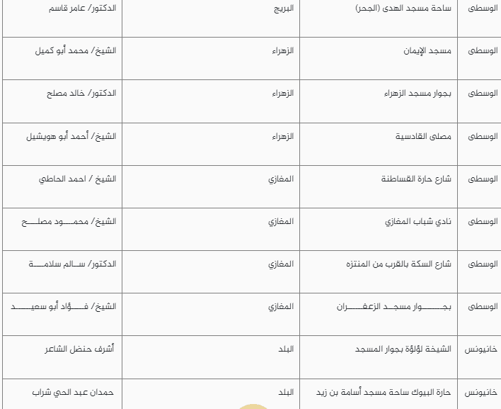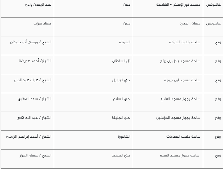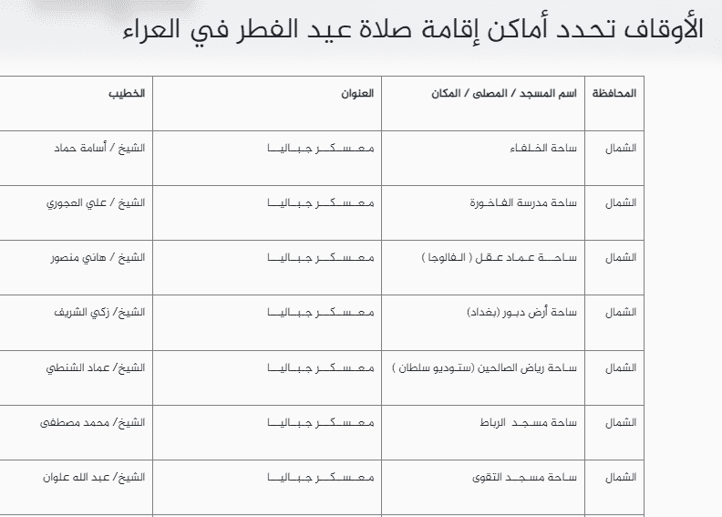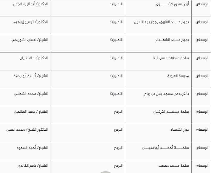 وأعلنت الأوقاف قائمة عبر موقعها الإلكتروني تتضمن أماكن إقامة صلاة العيد في العراء بمحافظات قطاع غزة بما يشمل الشمال والجنوب خانيونس ورفح والوسطى أيضا ومدينة غزة.