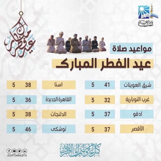 موعد توقيت صلاة عيد الفطر في مصر 2022 وفق ما نشرته دار الإفتاء المصرية عبر تويتر حيث أوردت قائمة تشمل مواعيد صلاة العيد في جميع المحافظات من بينها العاصمة القاهرة.