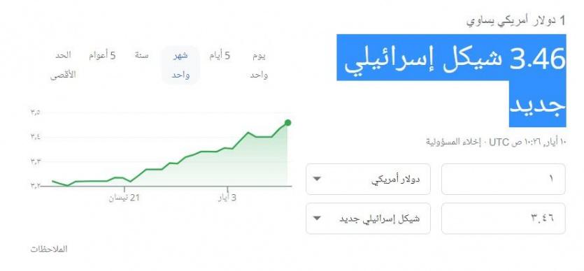 ووصل سعر صرف الدولار مقابل الشيكل الاسرائيلي، الآن، 3.46 شيكل.