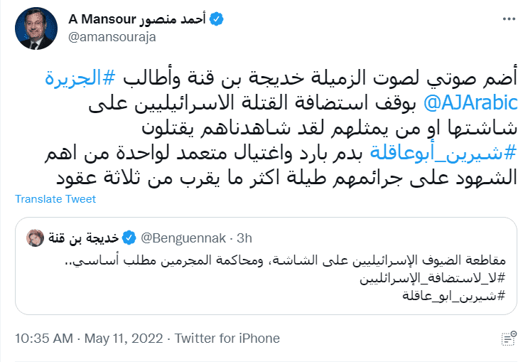 فيما انضم لها الصحفي أحمد منصور في تغريدة له على تويتر :" أضم صوتي لصوت الزميلة خديجة بن قنة، وأطالب الجزيرة بوقف استضافة القتلة "الإسرائيليين" على شاشتها أو من يمثلهم لقد شاهدناهم يقتلون شيرين أبو عاقلة بدم بارد واغتيال متعمد لواحدة من أهم الشهود على جرائمهم طيلة أكثر ما يقرب من ثلاثة عقود.