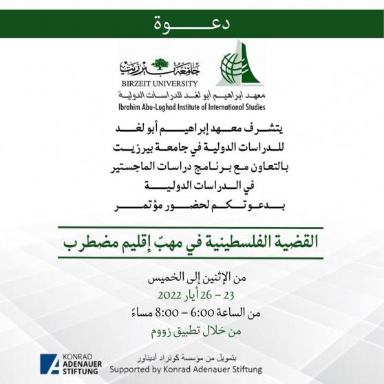 يستعد معهد إبراهيم أبو لغد للدراسات الدولية في جامعة بيرزيت وبالتعاون مع برنامج ماجستير الدراسات الدولية لعقد مؤتمر دولي بعنوان: "القضية الفلسطينية في مهبّ إقليم مضطرب".
