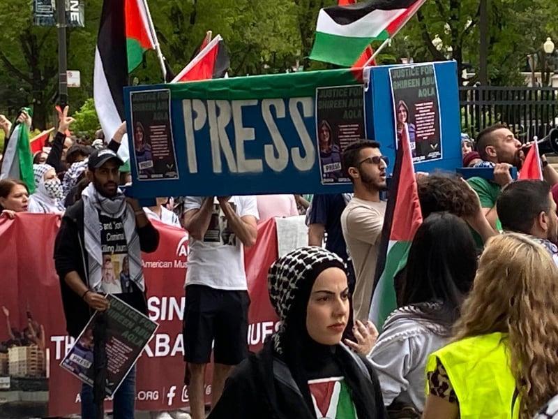 ورفع المشاركون الأعلام الفلسطينية ومفاتيح تعبر عن حق العودة وصور الصحفية شيرين أبو عاقلة، منددين باستمرار الجرائم الاسرائيلية بحق المدنيين الفلسطينيين ومطالبين بمحاسبة قتلة الصحفية شيرين أبو عاقلة وذلك بدعوة من التحالف من أجل فلسطين "شيكاغو".