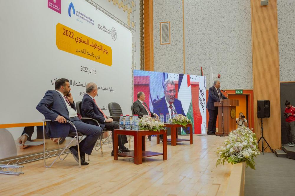 من جانبه، أشاد رئيس مجلس صندوق الاستثمار الفلسطيني د. محمد مصطفى بجهود جامعة القدس ممثلة برئيسها أ.د. أبو كشك في تشجيع الشباب والعمل من أجل تمكينهم لبدء أعمالهم في أماكن مختلفة، إلى جانب رفدها سوق العمل بكم من التخصصات المتميزة، مشيرًا إلى أن هذه المشاركة للصندوق بمثابة تكريم لصمود الأهالي في القدس، ورسالة هامة مفادها تمكين الشباب كمهمة وطنية، وتوفير الأدوات اللازمة لضمان انخراطهم في السوق بطريقة منتجة، وهو ما يتيحه هذا اليوم من خلال تعريفهم على الشركات واحتياجاتها وفرصها.
