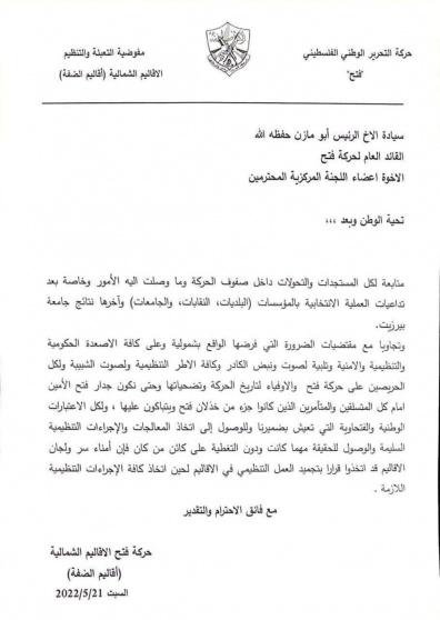 وجاء ذلك في البيان الصادر عن حركة فتح الاقاليم الشمالية "اقاليم الضفة" تجاوبا مع ما اسموه مقتضيات الضرورة التي فرضها الواقع بشمولية وعلى كافة الاصعدة الحكومية والتنظيمية والامنية وتلبية لصوت ونبض الكادر وكافة الاطر التنظيمية ولصوت الشبيبة ولك الحريصين على حركة فتح.