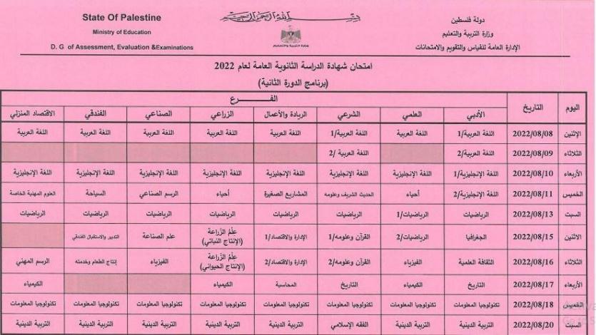 جدول امتحانات الثانوية العامة التوجيهي في فلسطين 2022 بعد التعديل