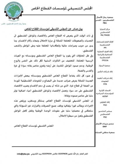 وأعرب المجلس التنسيقي لمؤسسات القطاع الخاص عن استنكاره واستغرابه ورفضه لهذه الإجراءات، مطالبا فورا بإيقافها ووقف جميع التصرفات والقرارات غير المسؤولة والتي ستنعكس في محصلتها سلبا على مقومات الوحدة الوطنية وتثقل كاهل المواطن الفلسطيني وتعزز من سيطرة الاحتلال، وفق البيان.