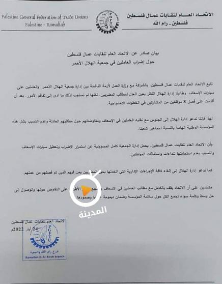 حمل الاتحاد العام لعمال فلسطين إدارة جمعية الهلال الأحمر المسؤولية عن ازمة اضراب العاملين في خدمات الإسعاف والطوارئ وتعطيل سيارات الإسعاف، ودعاها لإلغاء الإجراءات الإدارية التي اتخذتها بحق المضربين