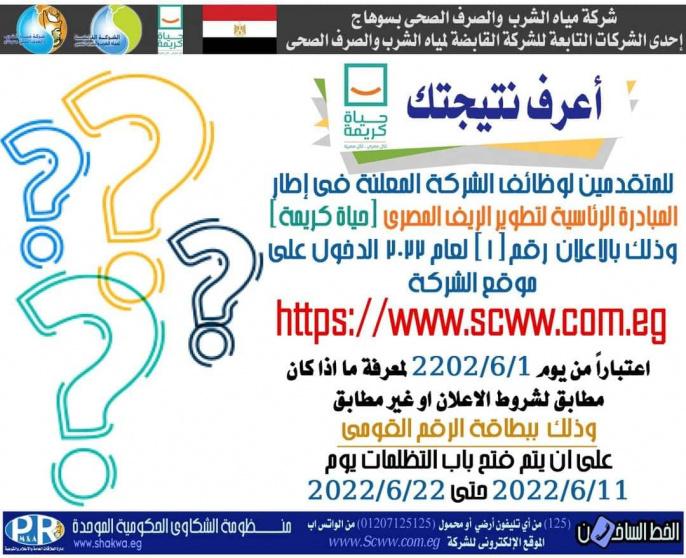 تعلن شركة مياه الشرب والصرف الصحي بسوهاج غداً الاربعاء الموافق 1 يونيه 2022 نتيجة المطابقين والغير مطابقين للمتقدمين لوظائف الشركة المعلن عنها فى اطار المبادرة الرئاسية لتطوير الريف المصري حياة كريمة.
