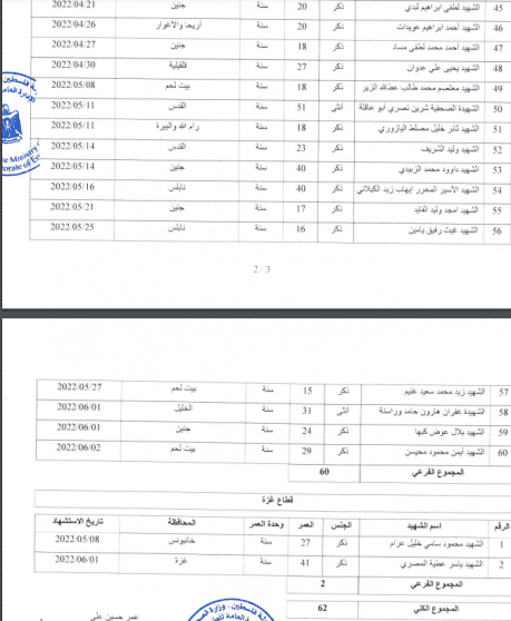 وبحسب ما نشرته وزارة الصحة، فقد استشهد 60 مواطنا بالضفة الغربية منذ بداية العام الحالي، بالإضافة إلى شهيدين اثنين من قطاع غزة.
