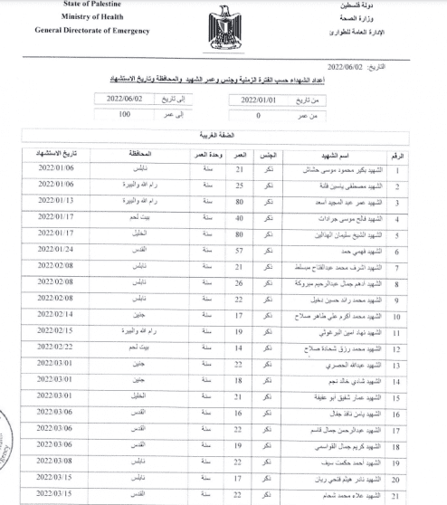نشرت وزارة الصحة الفلسطينية، اليوم الخميس، حصيلة تتضمن عدد وأسماء الشهداء الفلسطينيين الذين ارتقوا برصاص قوات الاحتلال الإسرائيلي منذ بداية العام الجاري 2022.
