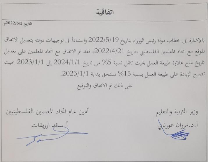 من جهته، قال الاتحاد العام للمعلمين في بيان له: "تم الاتفاق على تعديل الاتفاق الموقع مع الاتحاد بتاريخ 21/4/2022 لتصبح الزيادة على طبيعة العمل 15% تنفذ بداية 1/1/2023 اضافة الى 15% اخرى بدل العلاوات الاشرافية".