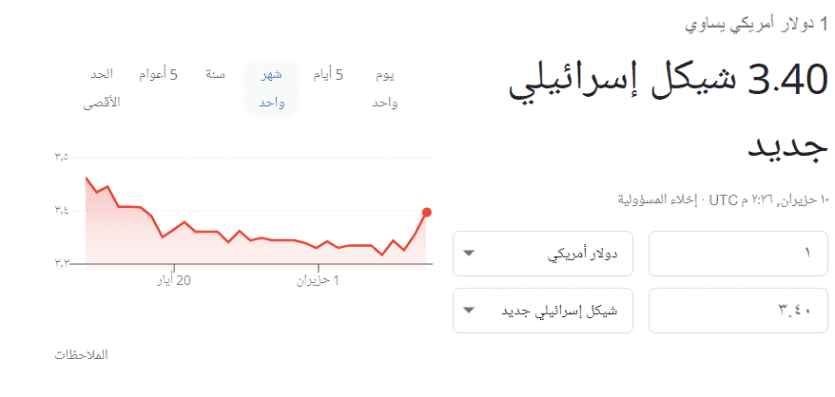 شهد سعر صرف الدولار الآن مقابل الشيكل الاسرائيلي، مساء اليوم الجمعة، 10 يونيو 2022، ارتفاعا كبيرا في التداولات المصرفية، عما كان عليه في ساعات الصباح الأولى.