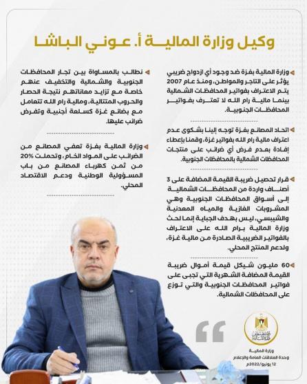 واعتبر الباشا في بيان رسمي نشرته الوزارة بغزة، ان قرار تحصيل الضريبة على 3 أصناف واردة من الضفة؛ ليس بهدف الجباية إنما لحث وزارة المالية برام الله على الاعتراف بالفواتير الضريبية الصادرة من مالية غزة ولدعم المنتج المحلي.