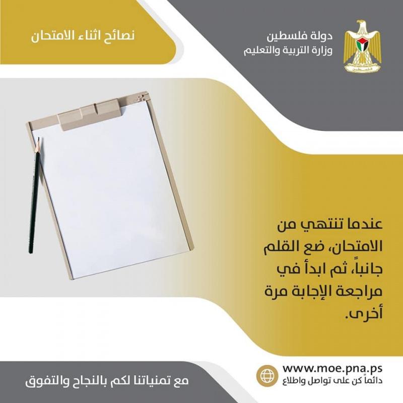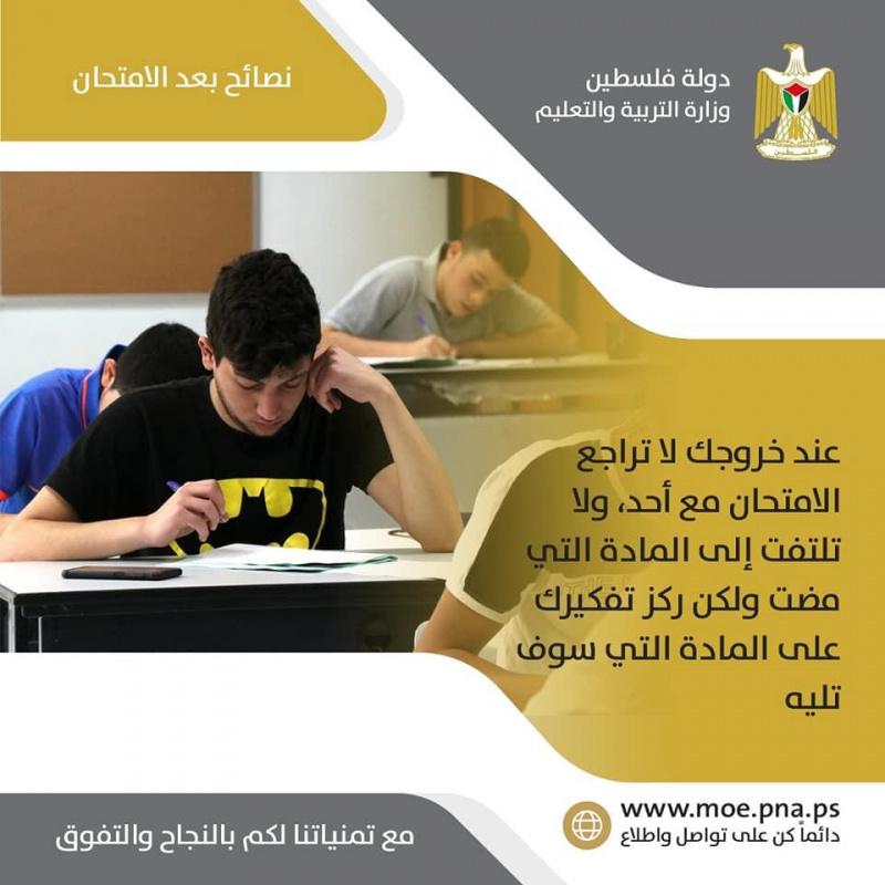 أصدرت وزارة التربية والتعليم اليوم الاثنين، مجموعة من النصائح لطلبة الثانوية العامة "التوجيهي"، وذلك مع اقتراب بدء الامتحانات، حيث من المقرر البدء بها يوم غدٍ الثلاثاء في كافة مدارس فلسطين ومدارس فلسطين بالخارج.
