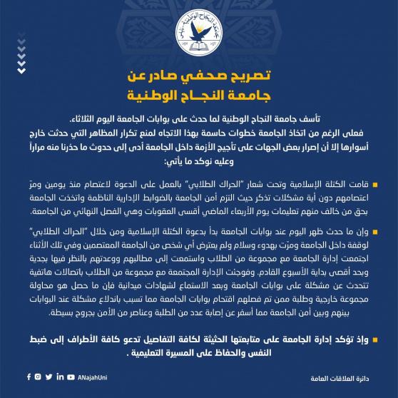 جامعة النجاح تصدر بيانا مهما تعقبا على أحداث اليوم