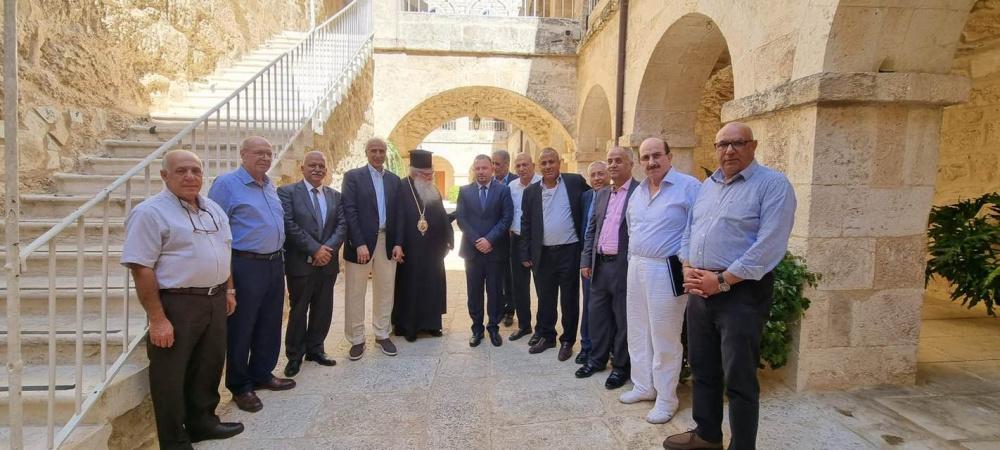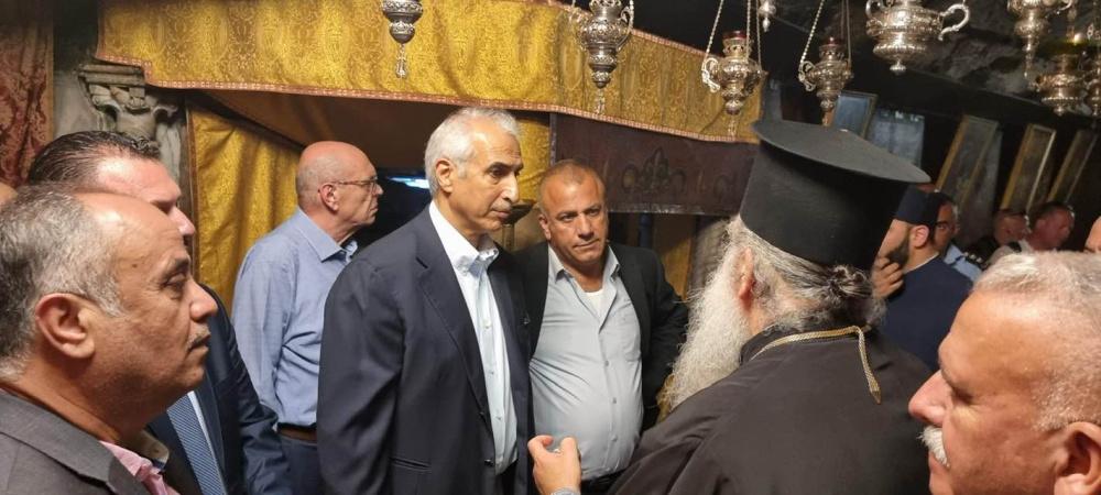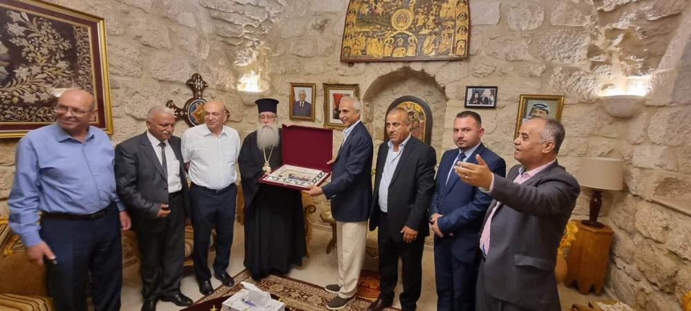 وبدأت الزيارة بزيارة كنيسة المهد، وكان في استقبالهم سيادة المطران بندكتوس ورؤساء البلديات الثلاث بيت لحم وبيت ساحور وبيت جالا، واطلع الوفد على الكنيسة واحتياجاتها وبعدها تم التوجه الى بلدية بيت ساحور.