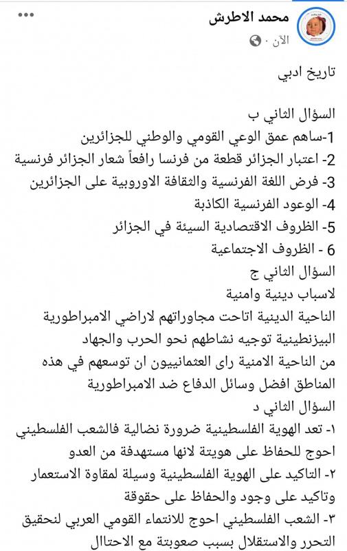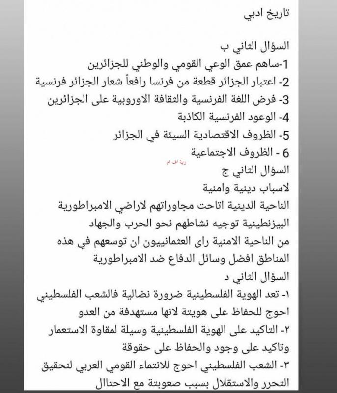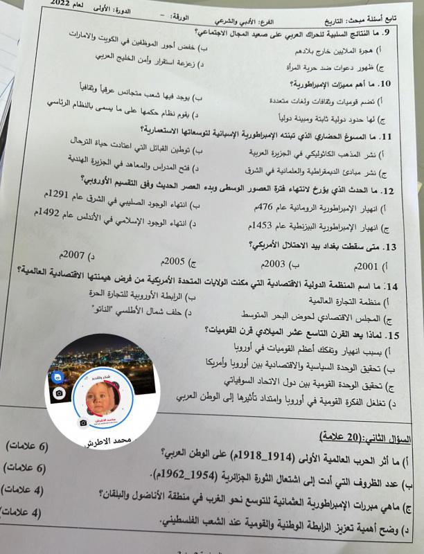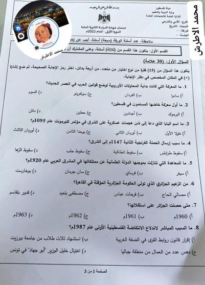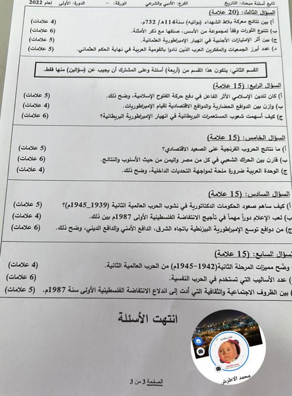 إجابات امتحان التاريخ للثانوية العامة 2022 توجيهي فلسطين الفرع الأدبي