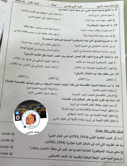 إجابات امتحان التاريخ للثانوية العامة 2022 توجيهي :