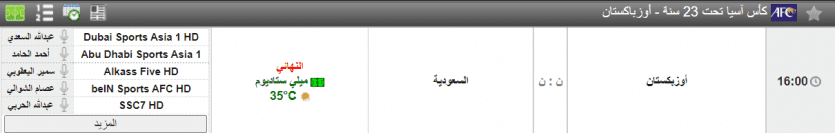 كما تبث مباراة المنتخب السعودي في هذا النهائي التاريخي على قناة السعودية الرياضية السابعة (SSC7 HD)، وأيضا (beIN Sports AFC HD)، وكذلك تنقل على دبي الرياضية (Dubai Sports Asia 1 HD).