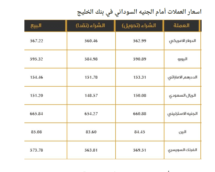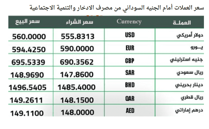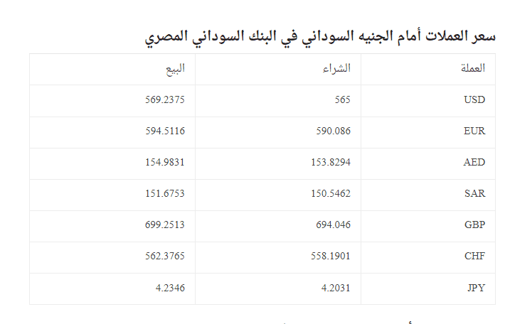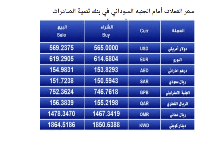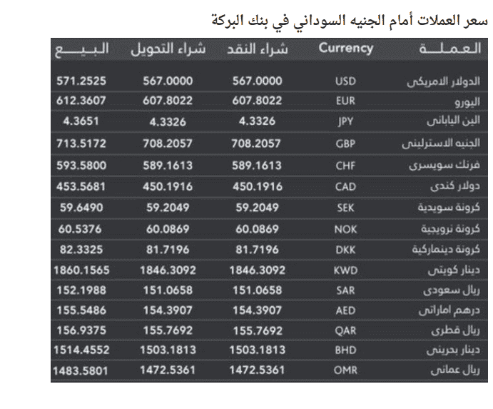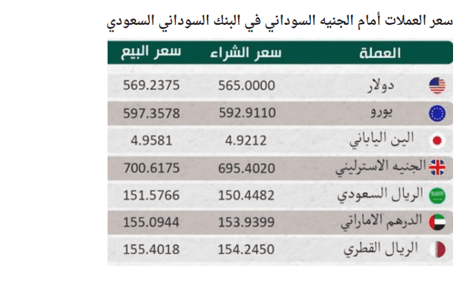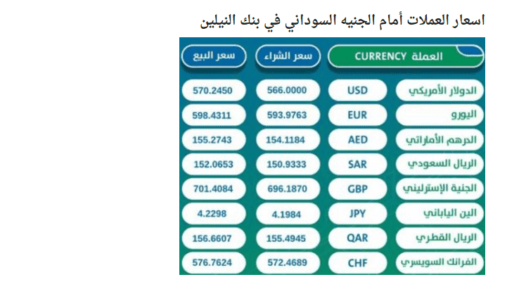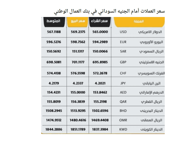 وبحسب المصادر، فقد بلغ سعر صرف الدولار الأمريكي 567 جنيها مقابل 570 جنيها سودانيا للبيع، في وقت يواصل البنك المركزي في السودان تلبية الطلبات كافة التي تقدمت بها المصارف لمقابلة احتياجات عملائها.