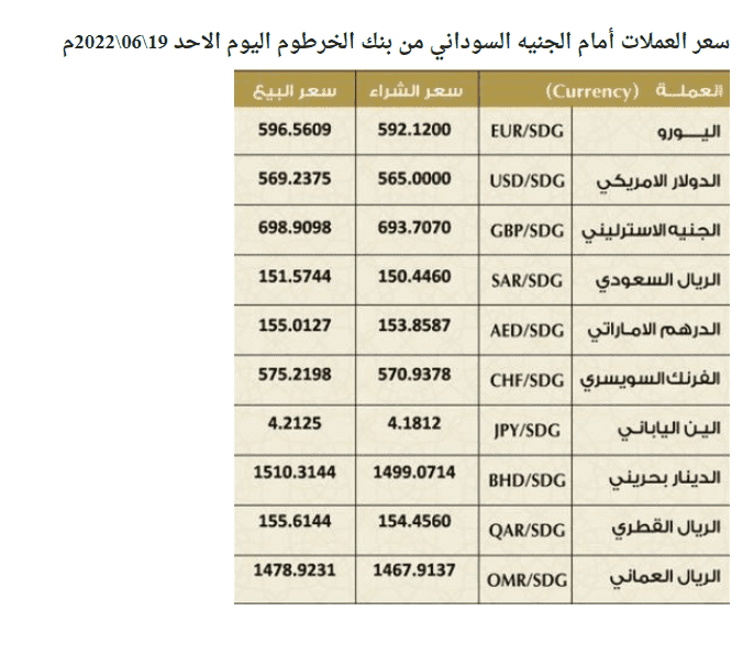 ننشر لكم متابعينا سعر صرف الدولار مقابل الجنيه السوداني في السودان في السوق السوداء والبنوك وفق تعاملات صباح يوم الأحد 19 يونيو / حزيران 2022، حيث يشهد السعر استقرارا نسبيا حتى لحظة نشر هذا التقرير.