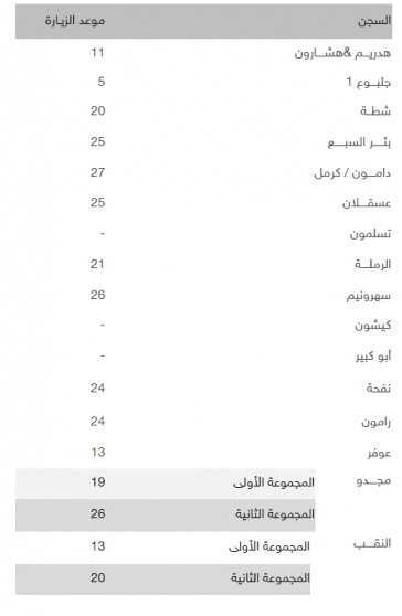 أعلن مكتب اللجنة الدولية للصليب الأحمر في جنين، اليوم الأحد، عن جدول برنامج زيارات أسرى جنين وطوباس لشهر تموز المقبل.