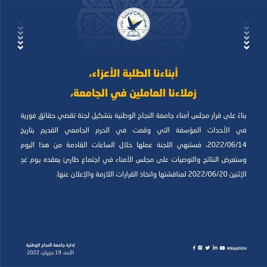 جامعة النجاح: لجنة التحقيق ستنهي عملها خلال الساعات القادمة