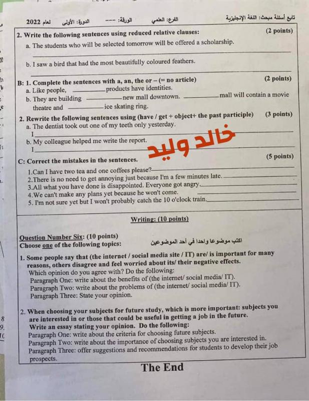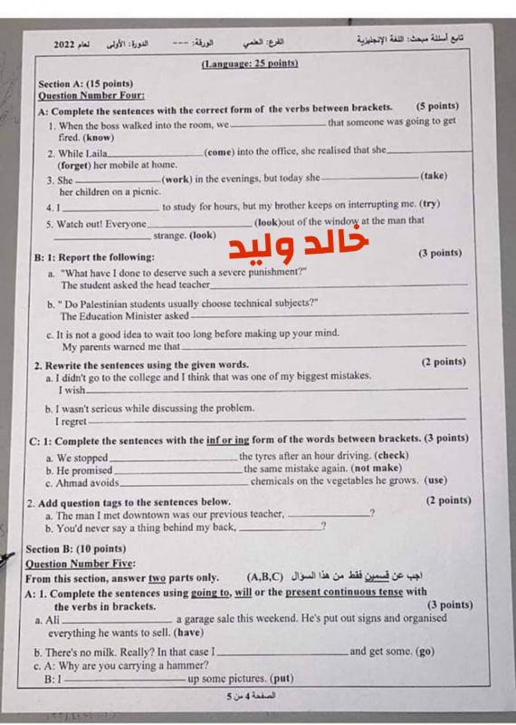 إجابات امتحان اللغة الإنجليزية للثانوية العامة 2022 توجيهي فلسطين الفرع العلمي