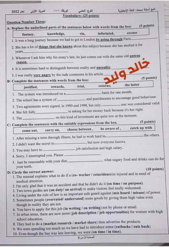 إجابات امتحان اللغة الإنجليزية للتوجيهي العلمي 2022: