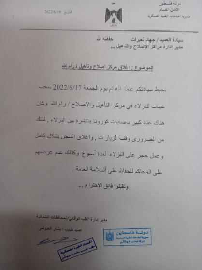 أعلنت مديرية الخدمات الطبية العسكرية الفلسطينية، عن إغلاق مركز اصلاح وتأهيل رام الله "سجن بيتونيا" بشكل كامل لمدة أسبوع، ومنع عرض النزلاء على المحاكم بسبب فيروس كورونا.