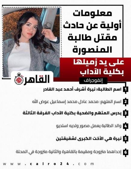 نيرة أشرف طالبة في الفرقة الثالثة بكلية الآداب قسم الاجتماع جامعة المنصورة من مواليد المحلة محافظة الغربية، وكانت في طريقها إلى الكلية اليوم مع زميلها المتهم من نفس المحافظة، إلا أنه طعنها وذبحها أمام بوابة الجامعة.