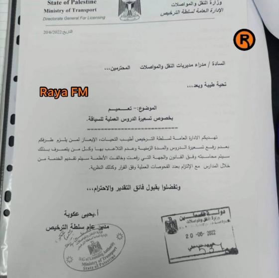 من جهتها، أعلنت سلطة الترخيص بوزارة النقل والمواصلات في تعميم حصلت عليه "رايــة"، عن موقفها الرسمي من مقترح مدارس السياقة، مؤكدة رفضها لرفع تسعيرة الدروس والمدة الزمنية، وأوعزت بعدم التلاعب بها.