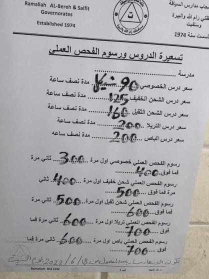 قالت مصادر خاصة لشبكة رايــة الإعلامية، أن مدارس السياقة في فلسطين تقدمت بمقترح لرفع تسعيرة درس السياقة الواحد من 90 الى 110 شيكل، على أن يكون مدة الدرس الواحد 40 دقيقة وعدد الدروس 15 درسا.