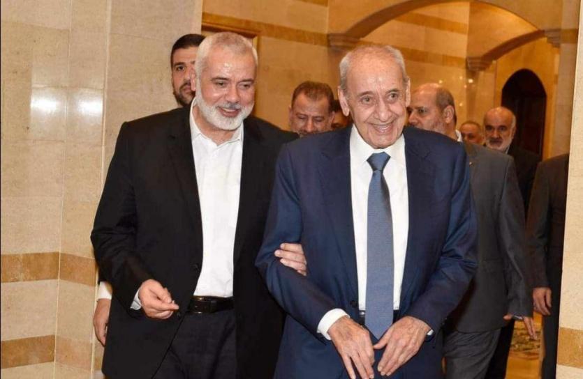 كما بارك هنية رئيس لبرّي استحقاقه الانتخابي، وفوزه في انتخابات مجلس النواب، وشكره على مواقفه الداعمة للقضية الفلسطينية في البرلمانات العربية. كما وجه رئيس الحركة شكرا خاصا له على متابعته الحثيثة لجريمة البرج الشمالي، ورعايته الخاصة للمصالحة مع حركة فتح، وأشاد بالموقف الموحد الذي أظهره لبنان بخصوص ترسيم الحدود، وأكد دعم الحركة لمثل هذه المواقف.