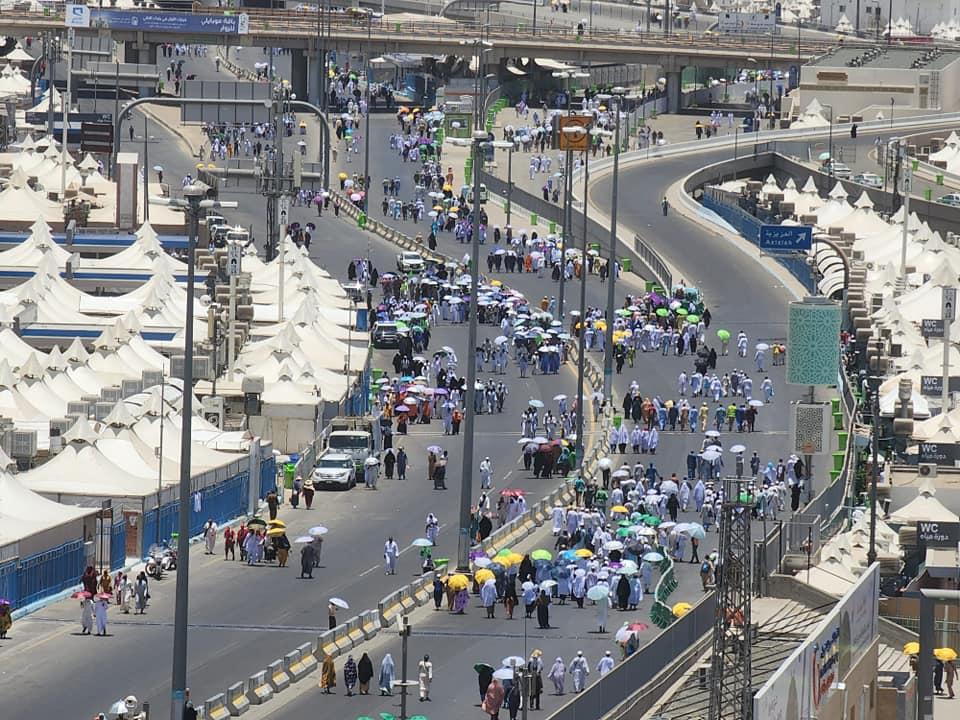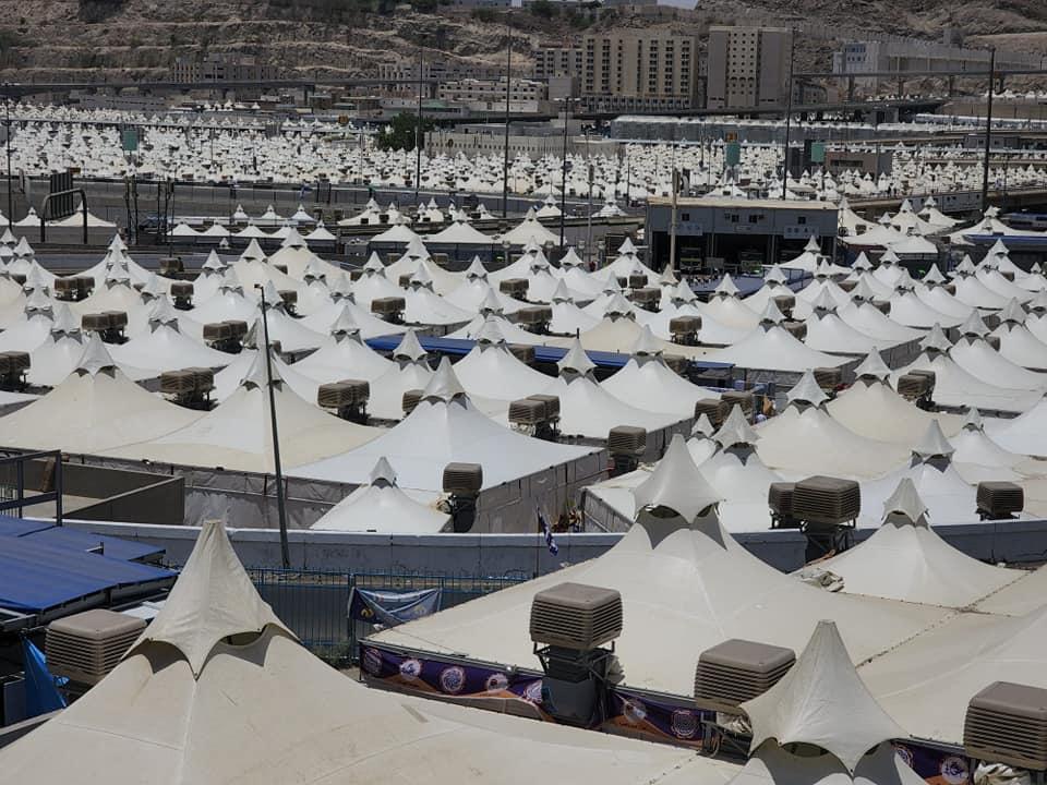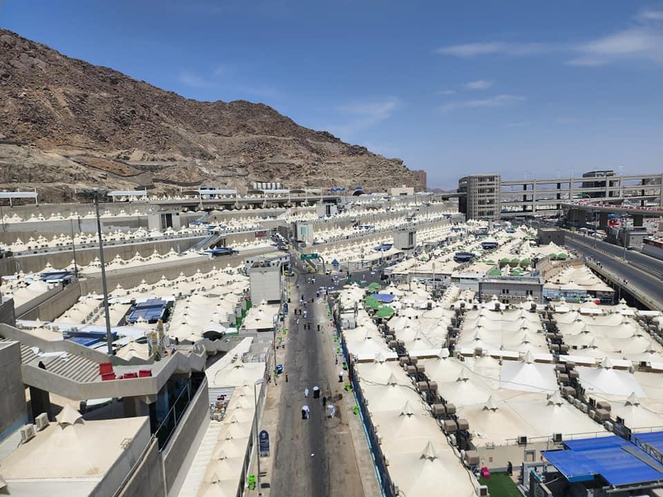 المنظر إجمالا لوادي منى يكسوه بياض "مدينة الخيام"، مستقر أكثر من 2.6 مليون حاج، وتخترقه طرق وجسور وأنفاق، وعنده تنتهي ممرات المشاة.