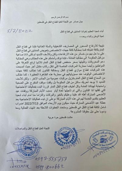 وأضافت اللجنة في بيان لها: "في ظل ارتفاع المصاريف التشغيلية وارتفاع أسعار المحروقات والمركبات الخصوصية التي تنقل الركاب، فإن قطاع النقل والمواصلات قرر اتخاذ اجراءات تصعيدية والاعلان عن إضراب شامل لكافة قطاع النقل في فلسطين".