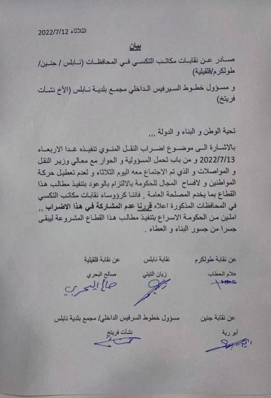 أصدرت نقابة مكاتب التكسي في المحافظات (نابس، جنين، طولكرم، قلقيلية) ومسؤول خطوط السيرفيس الداخلي مجمع بلدية نابلس، اليوم الثلاثاء، بياناً بخصوص الإضراب الشامل الذي أعلن عنه قطاع النقل العام.