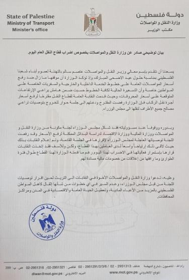 أصدرت وزارة النقل والمواصلات اليوم الأربعاء، بيانا دعت فيه النقابات إلى التريث لحين إقرار توصيات اللجنة التي شكلتها بهدف دراسة البدائل الممكنة لرفع الأسعار، من قبل مجلس الوزراء، وعدم السير في أي خطوات من شأنها إثقال كاهل المواطن الفلسطيني.