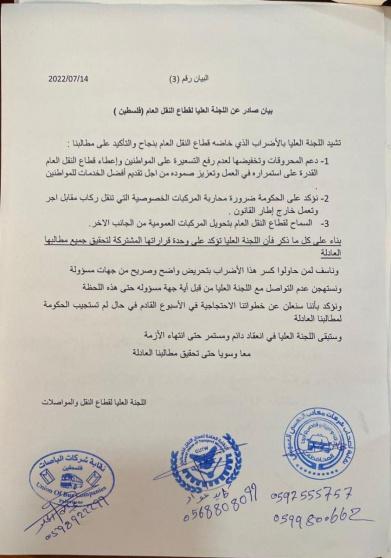 ويطالب قطاع النقل العام الحكومة بتثبيت سعر المحروقات للمركبات العاملة في النقل العام، بحد أعلى 5 شيكل، وكذلك محاربة ظاهرة المركبات الخصوصية التي تعمل على نقل الركاب مقابل اجر.