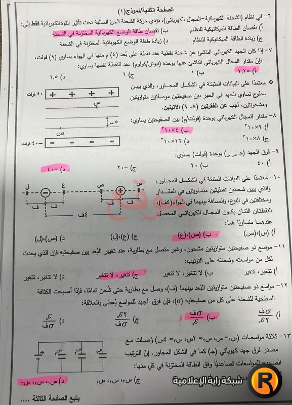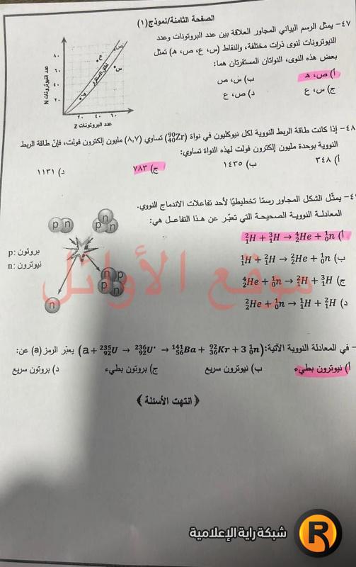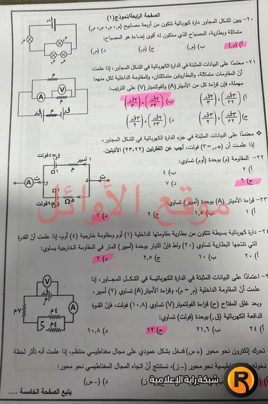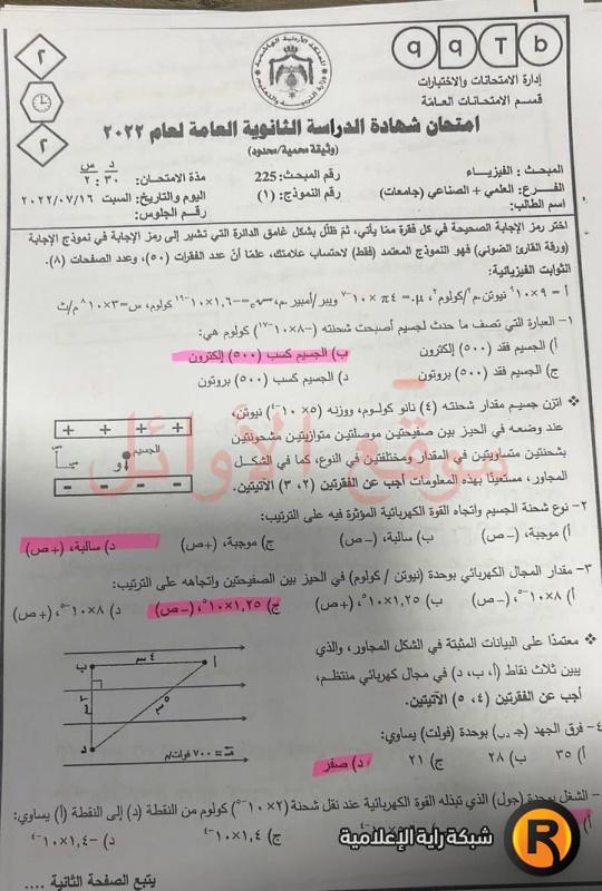 أجوبة امتحان الفيزياء 2022 التوجيهي الأردن: