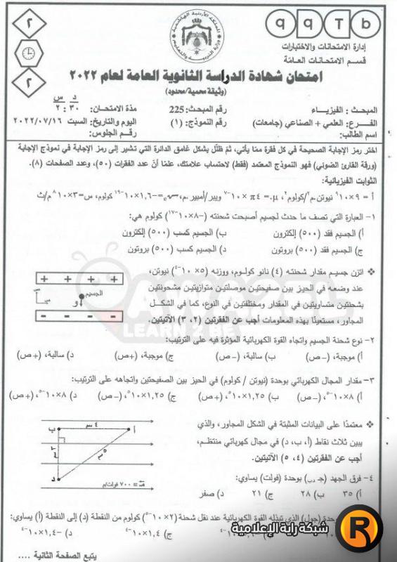حل امتحان الفيزياء 2022 توجيهي الأردن: