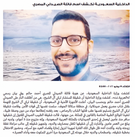 ونقلت الصحيفة أن موقع "العربية نت" نشر أن "وزارة الداخلية كشفت أن شقيقة المستشار تركي آل الشيخ، هي من أطلقت النار على الصيدلي المصري أحمد حاتم".