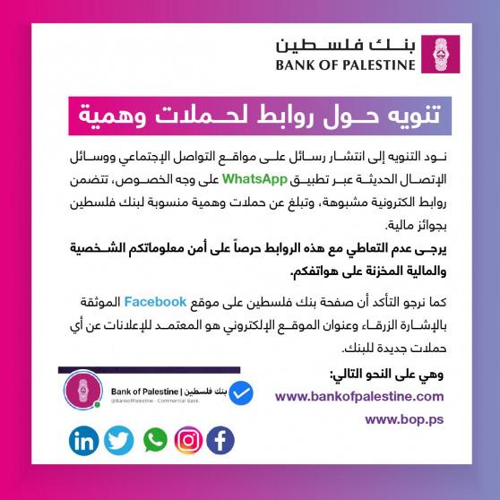 ودعا بنك فلسطين في تنويه نشره عبر صفحته في فيسبوك، إلى عدم التعاطي مع هذه الروابط حرصا على أمن المعلومات الشخصية والمالية المخزنة على الهواتف.